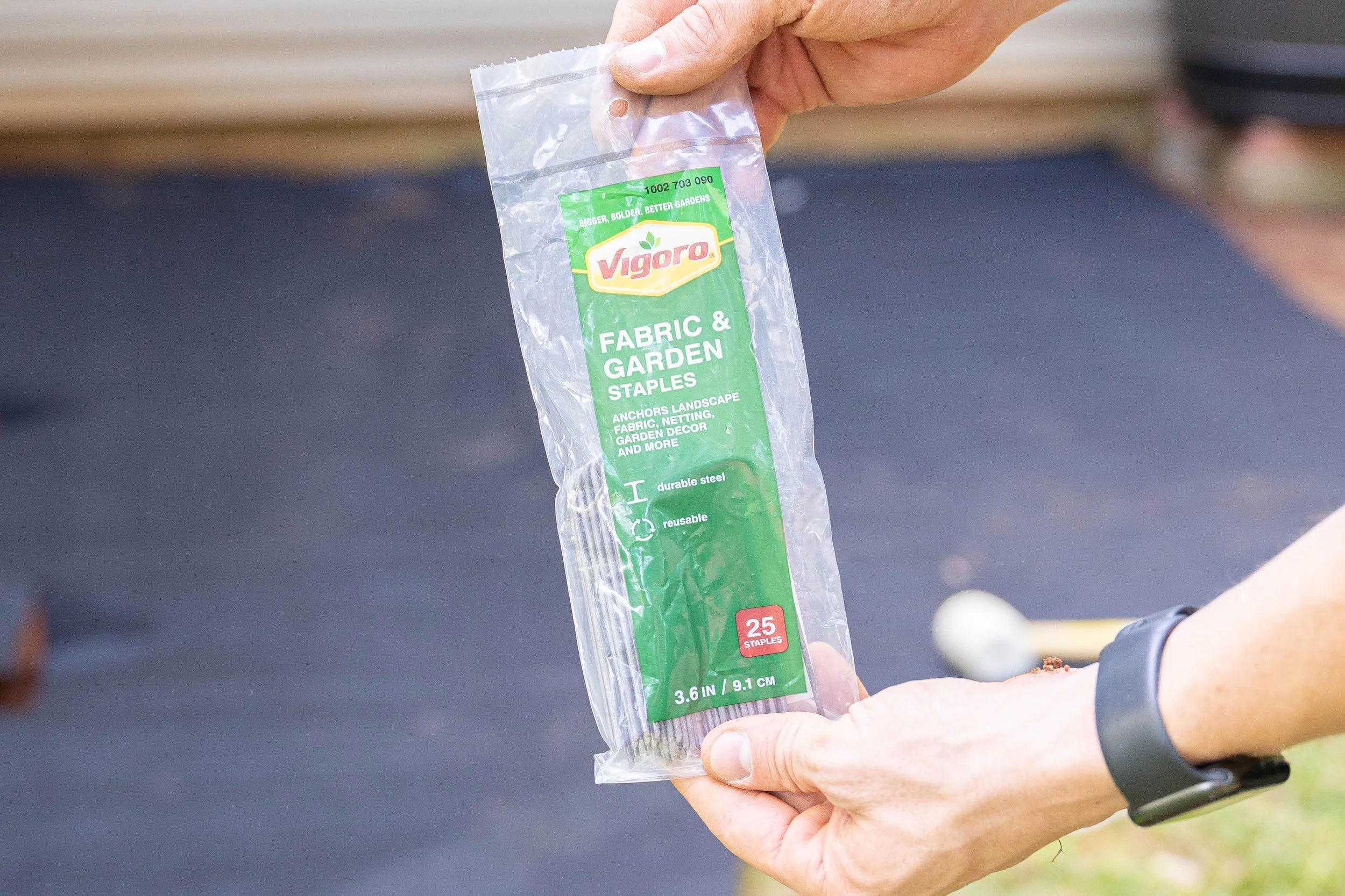 After we raked the area so that it was even and smooth, we laid out the Vigoro Landscape Fabric and secured it to the ground using landscape staples